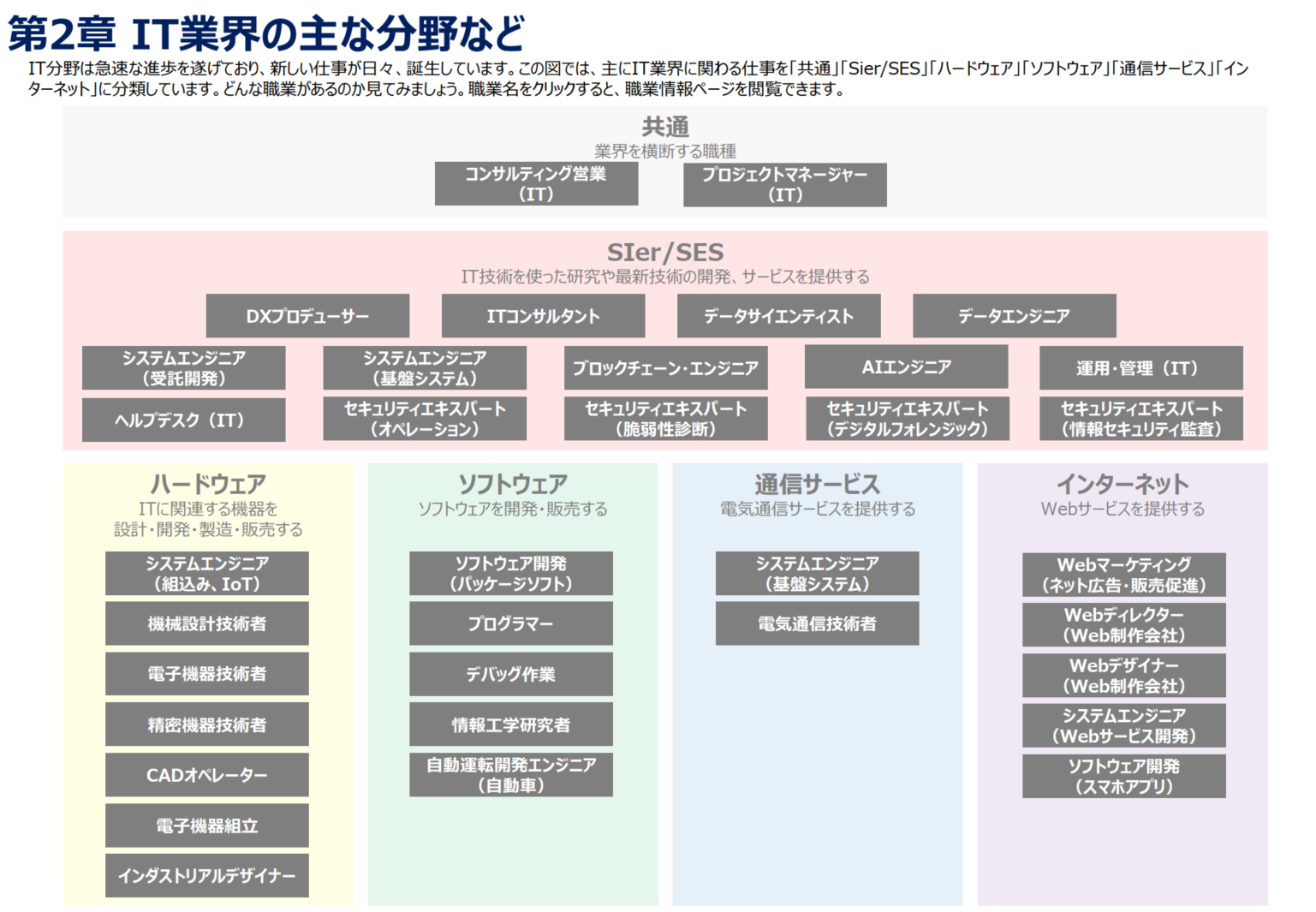 IT分野の主な職種 IT分野の裾野は広く、様々な職種が相互に連携してビジネスを進めています。